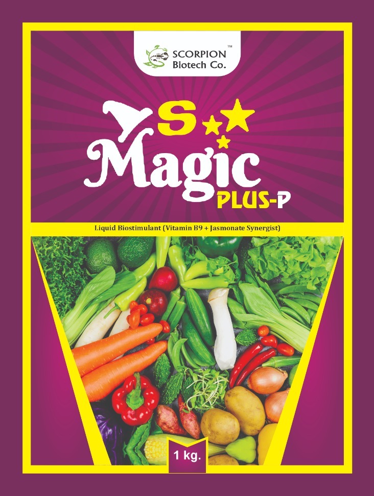 S Magic Plus P is a next-generation organic biostimulant formulated with Vitamin B9 (Folic Acid) and Jasmonate, a natural plant-signaling molecule. This synergistic blend enhances plant metabolism, promotes vigorous growth, improves flowering, and ensures superior fruit set across a wide range of crops.